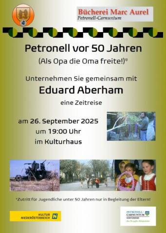 Am 26.09.2025 um 19.00 findet im Kulturhaus der Vortrag mit Eduard Aberham "Petronell vor 50 Jahren" statt.